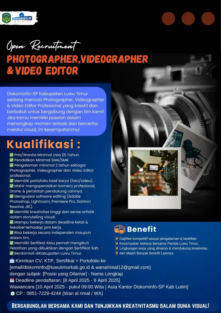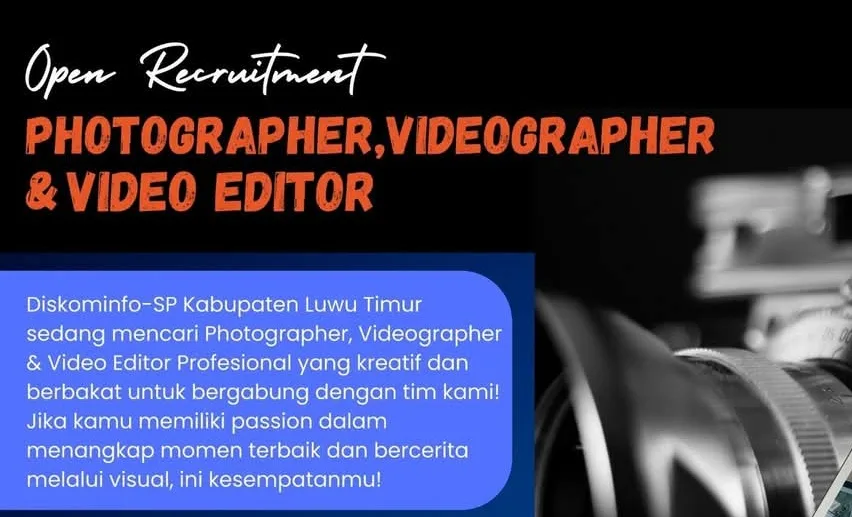 Dinas Komunikasi, Informatika, Statistik, dan Persandian (Diskominfo-SP) Kabupaten Luwu Timur kembali membuka kesempatan bagi para tenaga kreatif untuk bergabung sebagai Photographer, Videographer, dan Video Editor profesional.