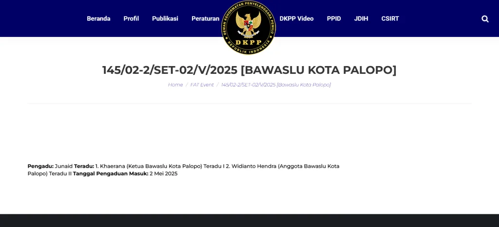 Berdasarkan data resmi dari situs DKPP, dua laporan pengaduan etik masuk pada tanggal 2 Mei 2025, sebelum PSU Pilkada Palopo digelar.