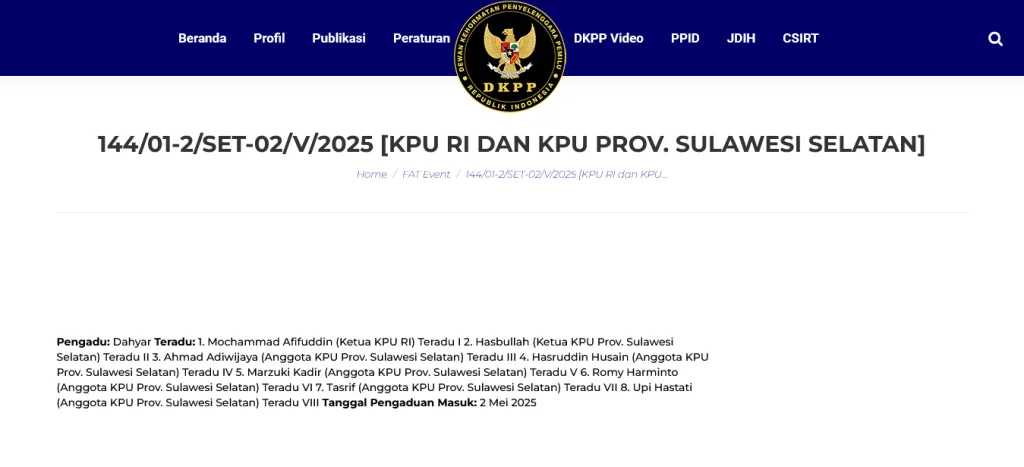 Laporan pertama dengan nomor perkara 144/01-2/SET-02/V/2025 diajukan oleh Dahyar, yang melaporkan Ketua KPU RI Mohammad Afifuddin bersama seluruh anggota KPU Provinsi Sulawesi Selatan.