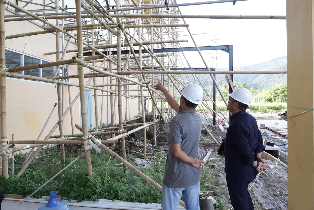 Irwan meninjau langsung progres pembangunan sambil berdiskusi dengan pelaksana proyek di lapangan.