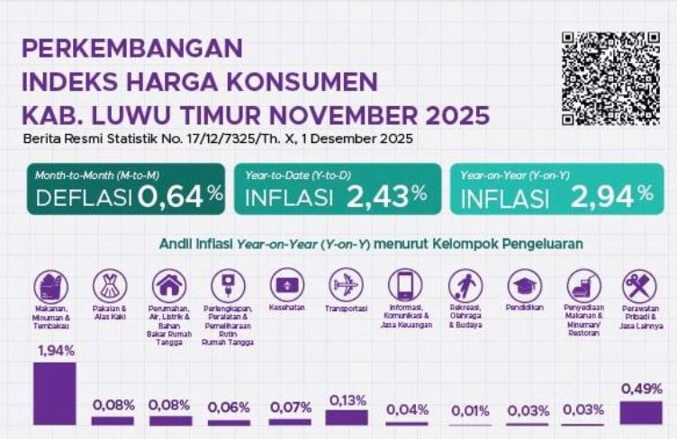Badan Pusat Statistik (BPS) Kabupaten Luwu Timur merilis data inflasi terbaru yang menunjukkan kenaikan tahunan (year-on-year) mencapai 2,94 persen pada November 2025.